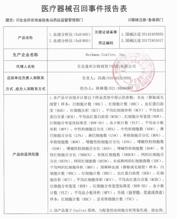 6月21日,国家药监局官网发布,贝克曼库尔特商贸(中国)有限公司报告,由于涉及产品可能存在血小板计数偶发性错误升高的问题,生产商Beckman Coulter, Inc.对血液分析仪(DxH600)(注册证编号:国械注进20142405955)及血液分析仪(DxH800)(注册证编号:国械注进20172401617)主动召回,召回级别为一级。
