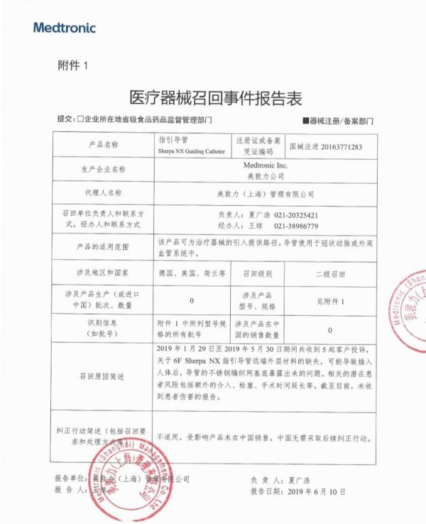 6月12日,美敦力(上海)管理有限公司报告,由于涉及产品存在远端外层材料缺失的问题,生产商Medtronic Inc.对指引导管 Sherpa NX Guiding Catheter(注册证号:国械注进20163771283)主动召回。召回级别为二级。