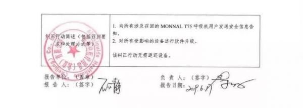 法液空医疗用品(北京)有限公司报告,由于医院在使用MONNAL T75 时,当医生使用可实施压力支持的通气模式,即PSV、PSV- NIV 或PS-PRO 时,部分MONNAL T75呼吸机出现了以下行为:如果压力支持设置为2cmH2O,用户将无法上调PEEP 设置,但该设置可下调至更低水平,如果用户随后改变通气模式,上述限制仍存在,如果不能增加PEEP,可能会导致通气不足的风险,该风险可能会波及患者。只有在更改压力支持设置为2cmH2O 时,才会触发软件故障,而压力支持的默认设置为10cmH2O,这限制了发生该故障的频率等原因, Air Liquide Medical Systems S. A. 对其生产的 呼吸机(注册或备案号:国械注进20153544098)主动召回。召回级别为三级 。