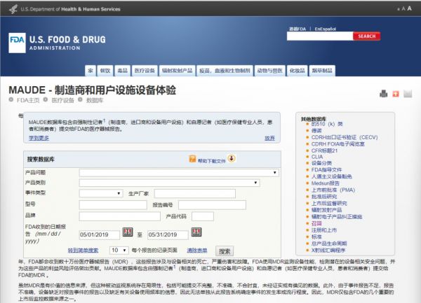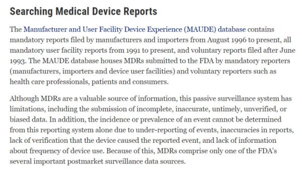 6月21日,FDA发布的《医疗器械报告(MDR):如何报告医疗器械问题》称,除了豁免企业的的隐藏报告,MAUDE数据库还包含:从1996年至今,制造商和进口商提供的报告;从1991年至今,所有使用者提供的报告;从1993年6月至今,患者、消费者、医疗专业人员等自愿提供的报告。