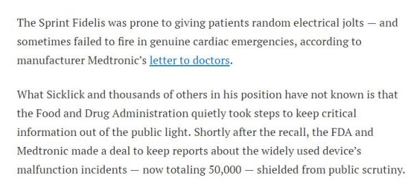 但是在Sprint Fidelis电极召回后不久,FDA和美国药物管理局与美敦力公司达成协议,保留有关广泛使用的设备故障事件报告,现在共计约50000例报告属于隐藏报告,在公众视野之外。