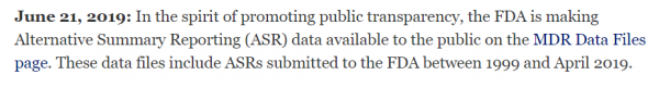 根据上述文件,FDA为了提高公众透明度,正在MAUDE数据库页面上向公众提供替代性总结报告数据,即“隐藏报告”的数据,这些数据文件包括1999年至2019年4月提交给FDA的ASR。
