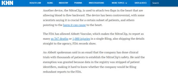 雅培同样使用豁免,来报告与其二尖瓣夹合系统MitraClip设备相关的死亡或受伤,雅培被允许在一份隐藏的文件中报告多达347人死亡或1000人受伤。
