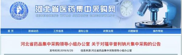 6月25日,河北省医药集中采购网发布《河北省药品集中采购领导小组办公室关于对福辛普利钠片集中采购的公告》。