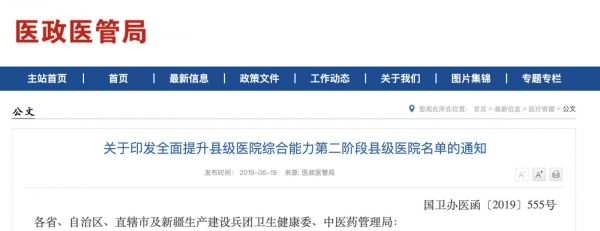 近日,医政医管局发布《关于印发全面提升县级医院综合能力第二阶段县级医院名单的通知》。