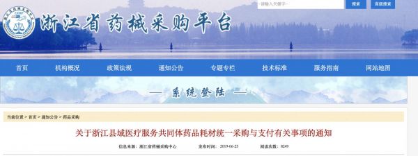无独有偶,进展更快的是浙江。浙江省药械采购平台发布文件《关于浙江县域医疗服务共同体药品耗材统一采购与支付有关事项的通知》(以下简称《通知》)。