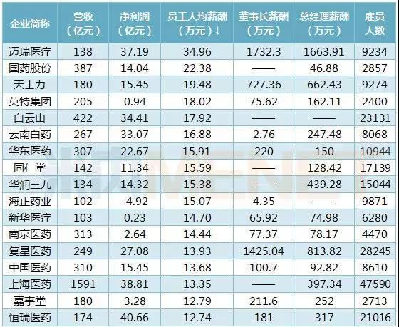 据米内网数据显示,共23家医药企业的员工人均薪酬超10万,10家公司超15万,其中,迈瑞医疗、国药股份、天士力位列前三,分别达到34.95万元、22.38万元和19.48万元,迈瑞医疗以12万的差距,遥遥领先第二名国药股份。