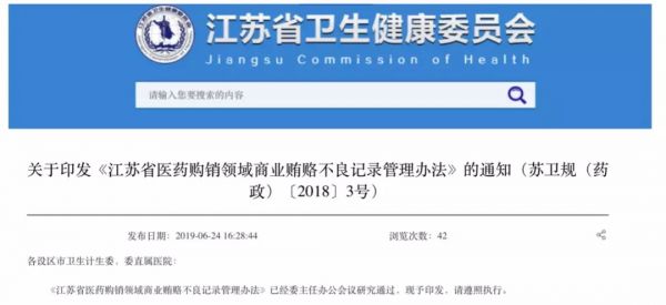 近日,江苏卫健委发布《江苏省医药购销领域商业贿赂不良记录管理办法》,重点打击医用设备、耗材等采购过程中的非法交易和商业贿赂行为。