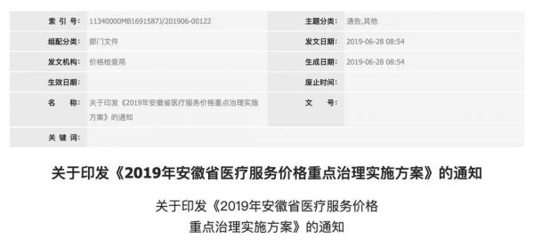 安徽此次《方案》是根据国家市场监管总局的《关于开展医疗服务价格重点治理的通知》、《2019年全国医疗服务价格重点治理实施方案》形成,重点治理内容也围绕总局的文件展开。