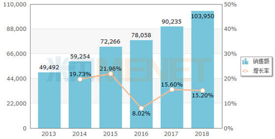 图2:2013-2018年中国公立医疗机构终端文拉法辛销售情况(单位:万元)