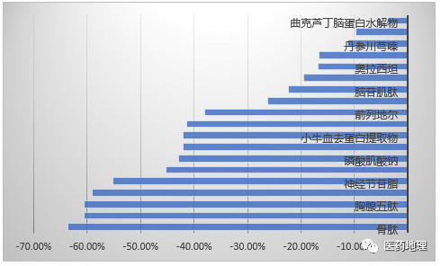 实际上,自2015年2月,国务院办公厅印发《关于完善公立医院药品集中采购工作的指导意见》,提出重点跟踪监控辅助用药,到如今第一批国家重点监控合理用药药品目录出台,国家重拳出击监管辅助用药的决心十分明显。从国家重点监控合理用药药品的增长情况来看,大部分品种已经明显感受到了冲击,2018年过半数增长率低于-20%,更甚者超过-60%。