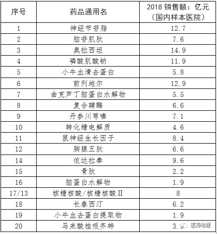 中国医药工业信息中心药物综合数据库PDB的数据显示,2018年第一批国家重点监控合理用药药品的销售额均在亿元以上,排名第一的奥拉西坦销售将近15亿。