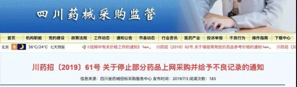 7月3日,四川省药械招标采购服务中心发布《关于停止部分药品上网采购并给予不良记录的通知》。