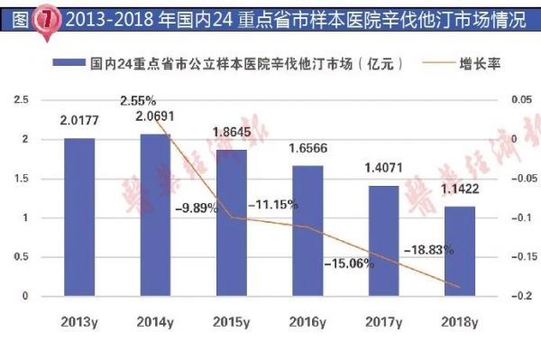 据米内网数据,2018年,国内24个重点城市公立样本医院辛伐他汀用药金额为1.1422亿元,同比下降18.83%。辛伐他汀制剂主要进入县城医院、农村卫生院和零售药店市场,预计国内市场销售额仍将突破20亿元。