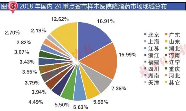 在2018年国内24个重点城市公立样本医院降血脂药市场中,居前五位的区域是:北京(占16.91%)、广东(占15.99%)、上海(占7.38%)、山东(占5.99%)和江苏(占5.63%)。降血脂药物是“4+7”城市药品集中采购中的“重头戏”,冲击了原研药在大中城市公立医院及城市社区医院的地位。