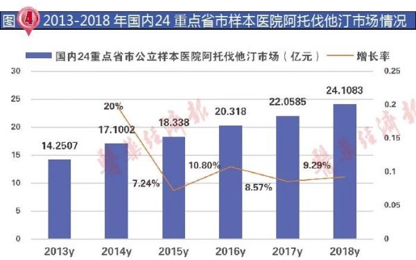 据米内网数据,2018年,国内24个重点城市公立样本医院阿托伐他汀钙用药市场为24.11亿元,同比增长9.29%。阿托伐他汀钙20mg占87.92%,10mg占12.08%。