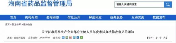 近日,海南省药监局发布《关于征求药品生产企业部分关键人员年度考试办法修改意见的通知》。