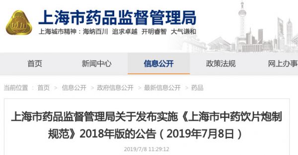 7月8日,上海市药监局也发布公告实施《上海市中药饮片炮制规范》2018年版。