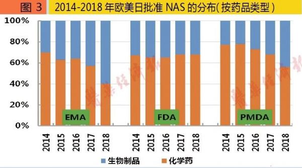 2018年批准的NAS中,FDA批准化学药41个、生物制品19个;EMA批准化学药16个、生物制品24个;PMDA批准化学药18个、生物制品14个。2014-2018年欧美日批准的NAS中,化学药占比各约为58%、67%与72%,可见还是以化学药为主。