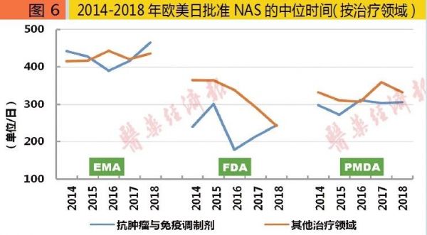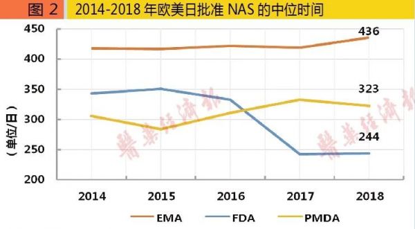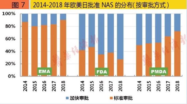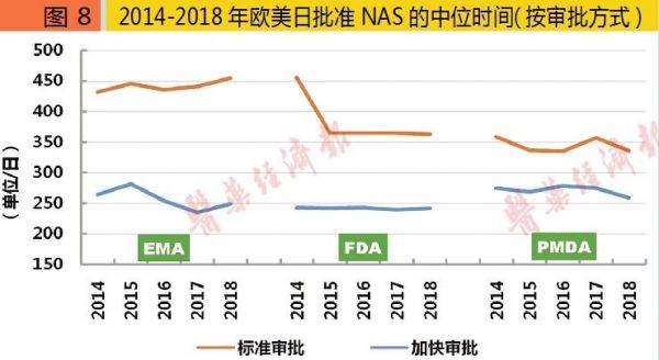 2018年,FDA批准的NAS中,加速审批所需时间242日,标准审批所需时间363日;EMA加速审批249日、标准审批455日;PMDA加速审批259日、标准审批336日。2014-2018年欧美日批准的NAS中,加速审批年均所需时间比标准审批各自快约185日、141日与73日。