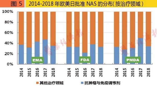 2018年,FDA批准的NAS中,抗肿瘤与免疫调节剂20个,其他治疗领域40个;EMA为抗肿瘤与免疫调节剂14个,其他治疗领域26个;PMDA为抗肿瘤与免疫调节剂11个,其他治疗领域21个。2014-2018年欧美日批准的NAS中,抗肿瘤与免疫调节剂占比各约为38%、33%与34%。