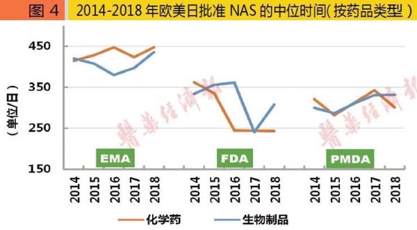 2018年,FDA批准的NAS中,化学药所需时间243日,生物制品所需时间308日;EMA批准化学药需447日、生物制品需436日;PMDA批准化学药需301日、生物制品需332日。2014-2018年欧美日批准NAS的年均所需时间,FDA是化学药快于生物制品,PMDA是生物制品与化学药基本持平,而EMA则是生物制品快于化学药。