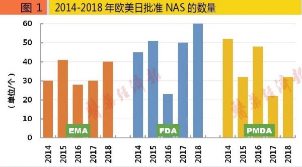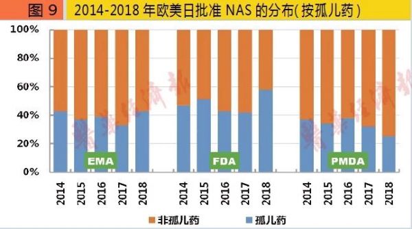 2018年,FDA批准的NAS中,孤儿药35个、非孤儿药25个;EMA孤儿药17个、非孤儿药23个;PMDA孤儿药8个、非孤儿药24个。2014-2018年欧美日批准的NAS中,孤儿药占比各约为39%、49%与34%。