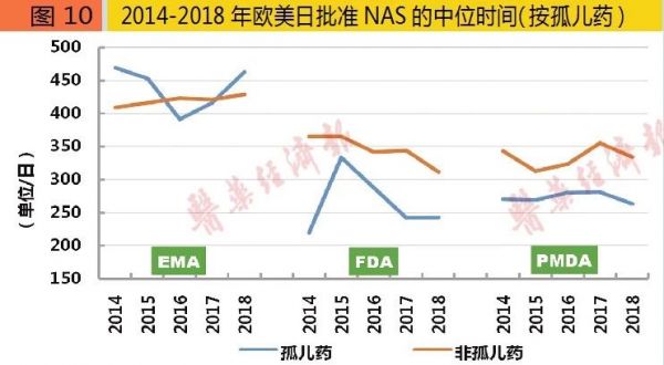 2018年,FDA批准的NAS中,孤儿药所需时间243日、非孤儿药所需时间311日;EMA孤儿药所需时间463日、非孤儿药所需时间429日;PMDA孤儿药所需时间263日、非孤儿药所需时间334日。2014-2018年欧美日批准NAS的年均所需时间,FDA与PMDA均是孤儿药明显快于非孤儿药;而EMA则是孤儿药与非孤儿药基本持平。