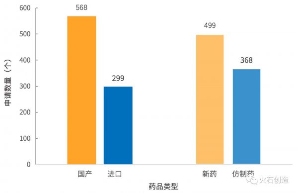 从申请类型来看,没有临床或补充申请,91个药品申请全部为申请上市生产,其中国产和进口药品申请分别有65和26个,新药申请占比分别为36.9%和100%