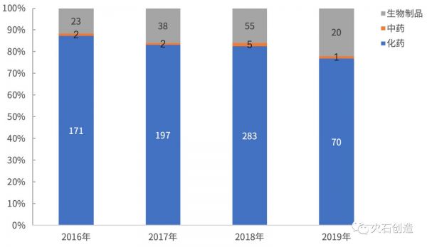 从药品类型来看,91个药品申请中新药申请50个,包括化药28个、生物制品21个和中药1个;仿制药申请均为化药,有41个,占比高达75.8%,依然占据明显优势。随着生物制品申请的逐年增加,化药比例正逐渐下降,从侧面折射出当前医药市场上生物药发展势头迅猛的现状。