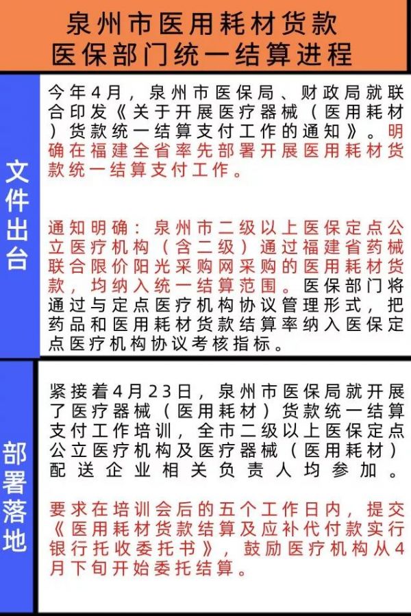实际上,今年4月,泉州市医保局就下发正式文件,明确全市开展医用耗材货款医保统一结算支付工作。