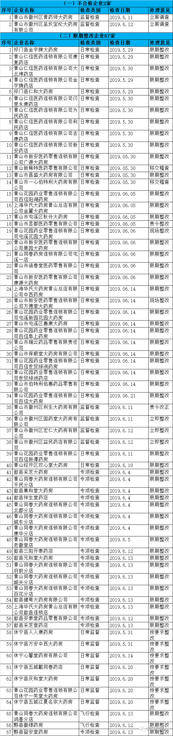 黄山市市场监督管理局检查药品零售企业90家,其中不合格企业2家,限期整改企业67家。