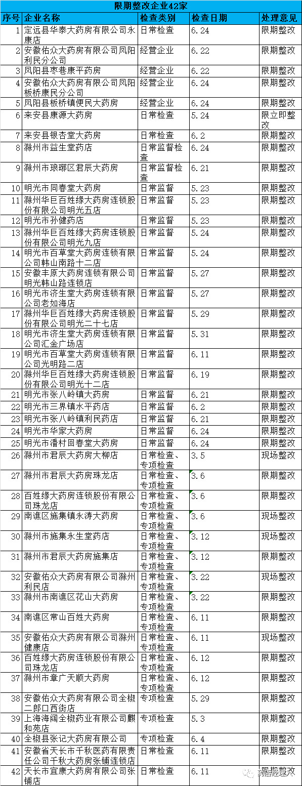 滁州市食品药品监督管理局检查药品零售企业 80 家,限期整改企业 42 家。