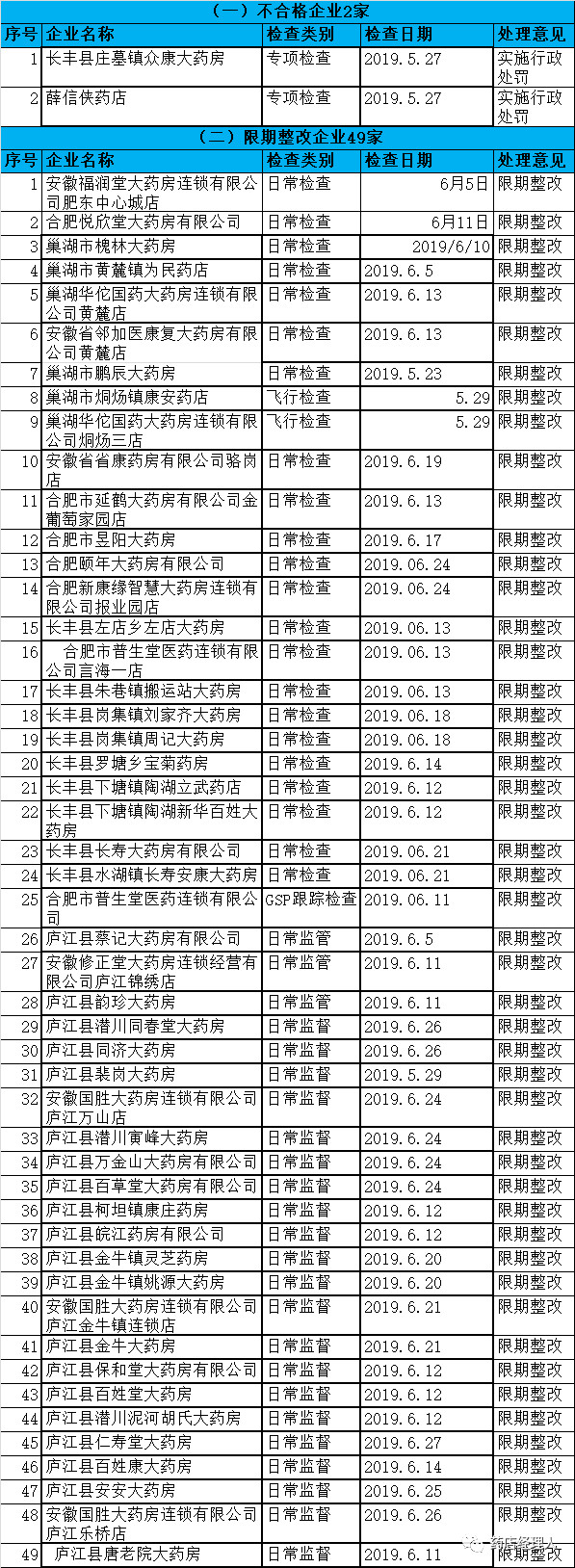 合肥市食品药品监督管理局药品零售企业226家,不合格企业2家,限期整改企业49家。