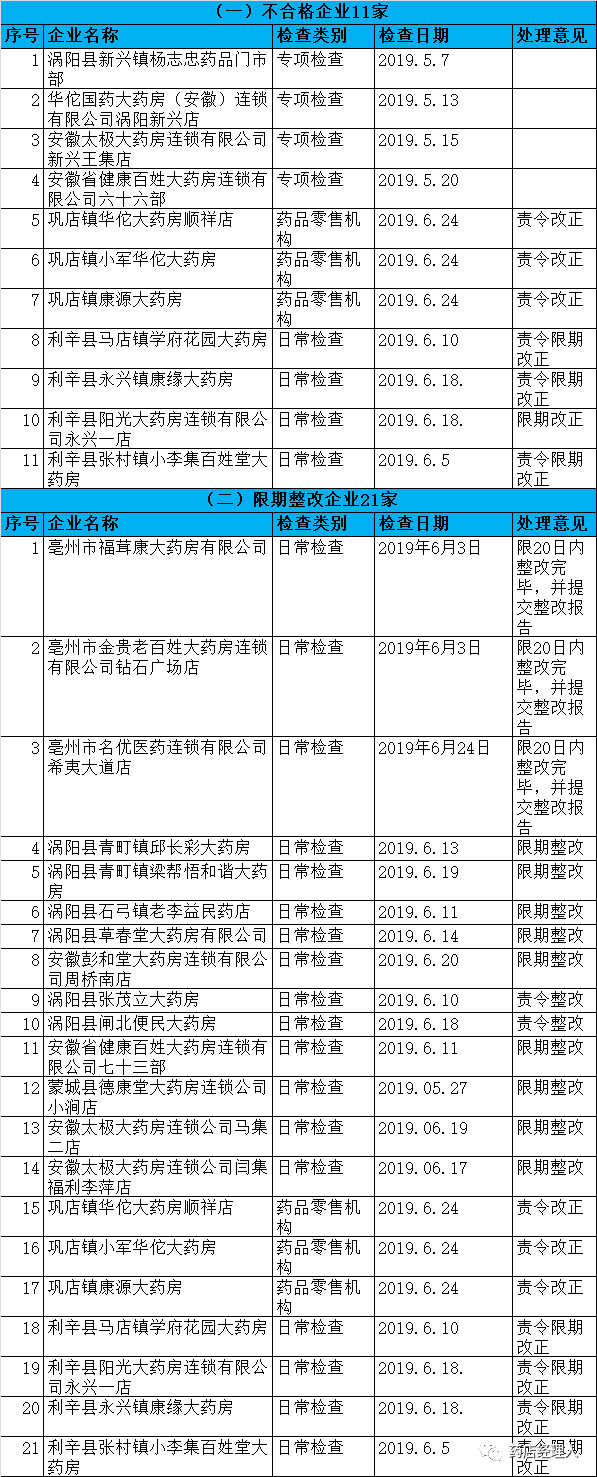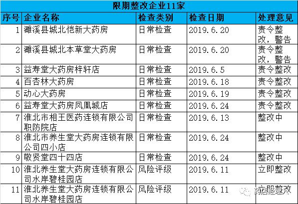 淮北市市场监督管理局检查药品零售企业43家,限期整改企业11家。