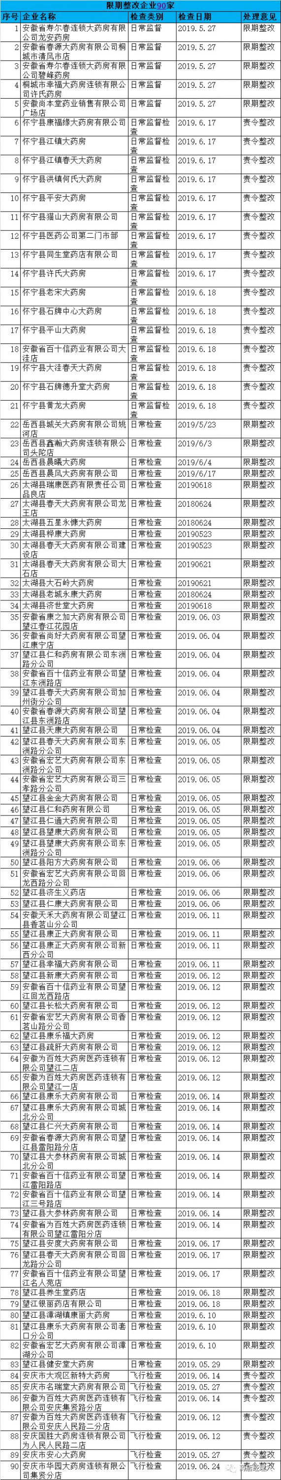 安庆市市场监督管理局检查药品零售企业112家,限期整改企业90家。