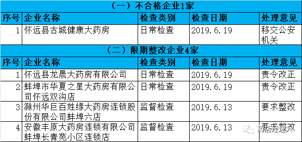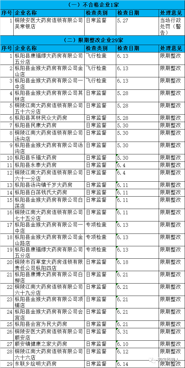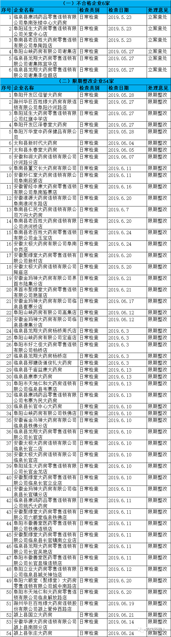 阜阳:60家药店被处罚 阜阳市市场监督管理局检查药品零售企业 300 家,其中不合格企业 6 家,限期整改企业 54 家。