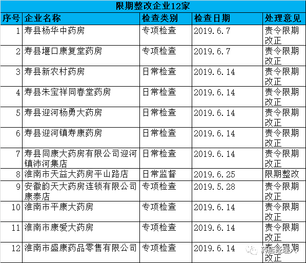淮南市市场监督管理局检查药品零售企业103 家,限期整改企业12家。