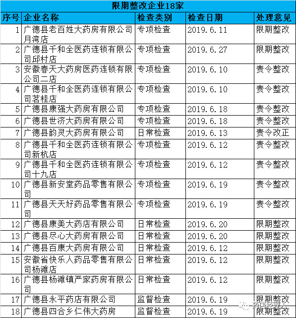 广德:18家药店被处罚 广德县市场监督管理局检查药品零售企业26家,限期整改企业18家。