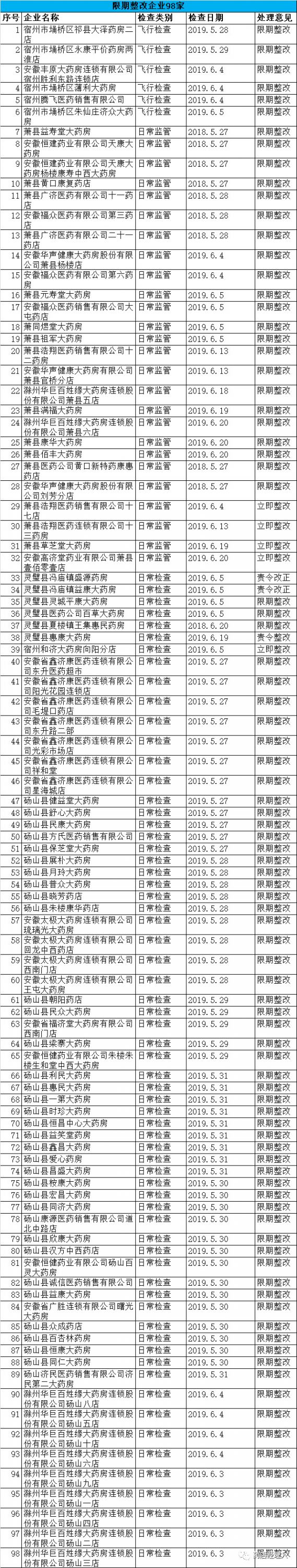 宿州市局药化流通科检查药品零售企业144家,限期整改企业98家。