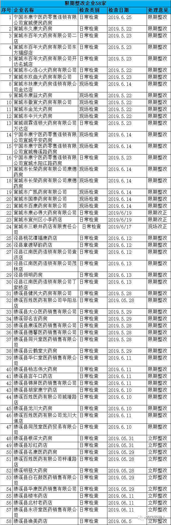 宣城市市场监督管理局检查药品零售企业79家,限期整改企业58家。
