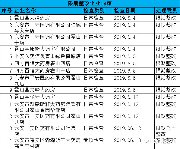六安:14家药店限期整改 六安市市场监督管理局检查药品零售企业104家,限期整改企业14家。
