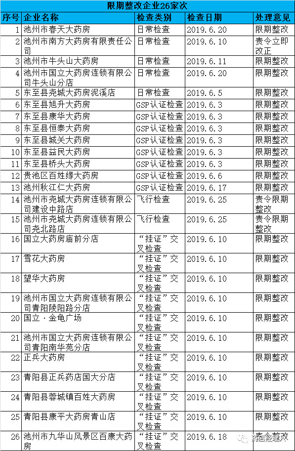 池州市市场监督管理局检查药品零售企业 59 家次,限期整改企业 26 家次。