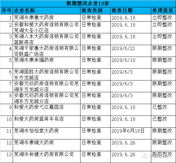 芜湖市食品药品监督管理局检查药品零售企业43家,限期整改企业13家。