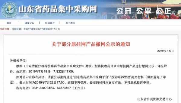 根据通知,《山东省医疗机构抗癌药专项集中采购文件》要求,拟将抗癌药目录内原挂网产品进行撤网公示,详见附件。公示期:2019年7月18日-7月22日17:00。