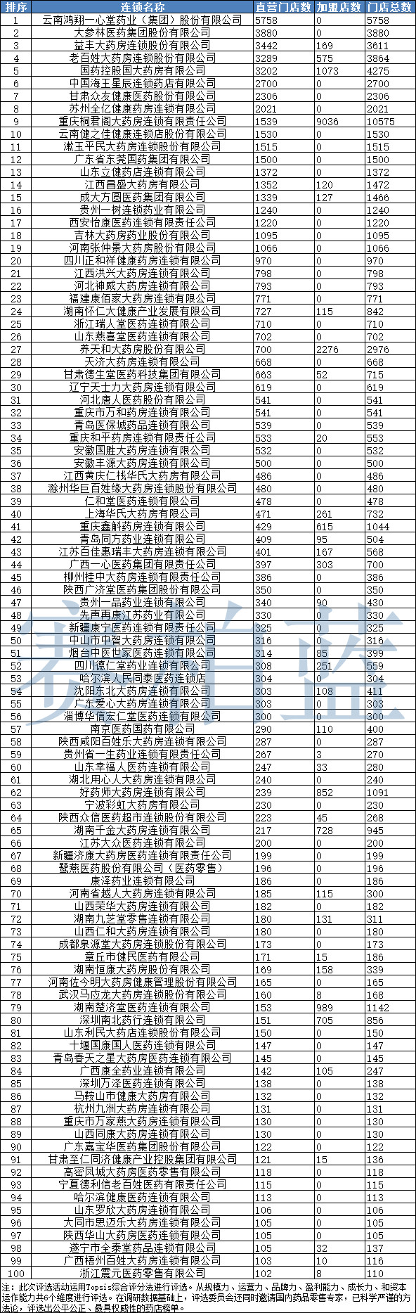 老百姓大药房连锁股份有限公司以3289家直营门店的数量排名第四;