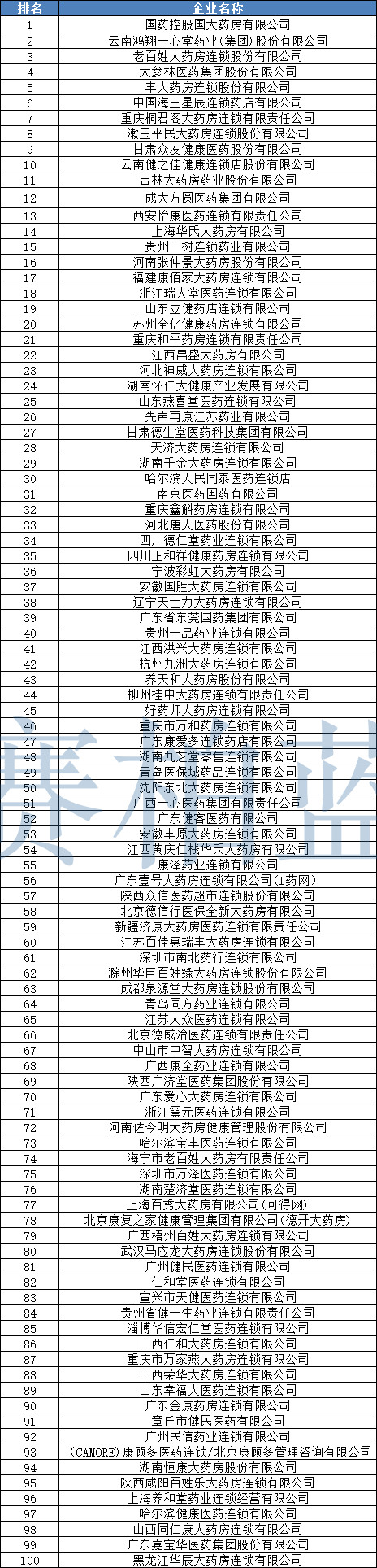 重庆桐君阁大药房连锁有限责任公司以1539家直营门店位列第九;