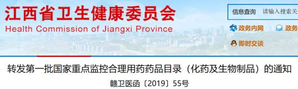 江西省卫健委要求各设区市卫生健康委、省直医疗机构,10个工作日内主动以政务公开、院务公开、官方网站公示等形式向社会公布本地区、本单位重点监控合理用药药品目录。
