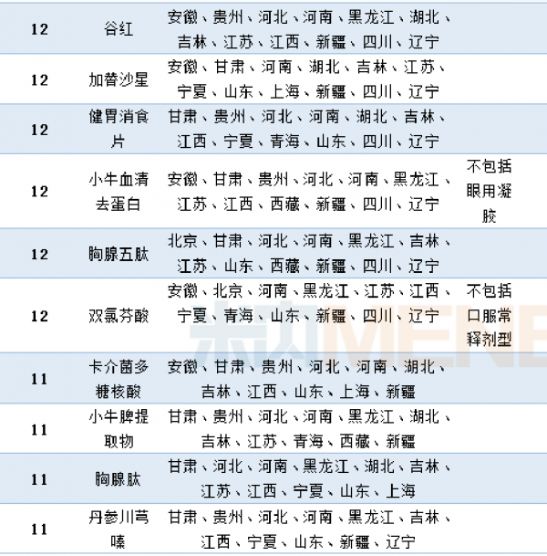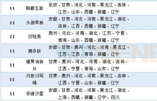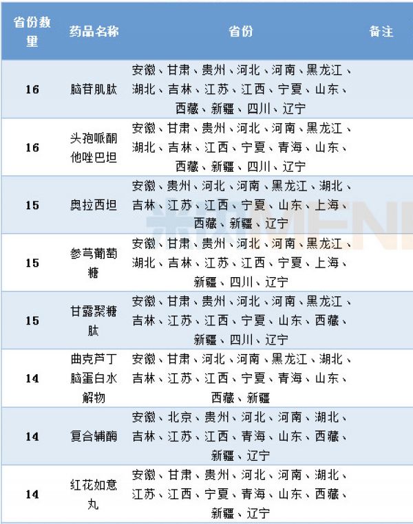 米内网数据显示,共有46个品种进入11个及以上省药品目录的增补目录中。其中,脑苷肌肽、头孢哌酮他唑巴坦、奥拉西坦、参芎葡萄糖及甘露聚糖肽进入的省增补目录达到15个以上。