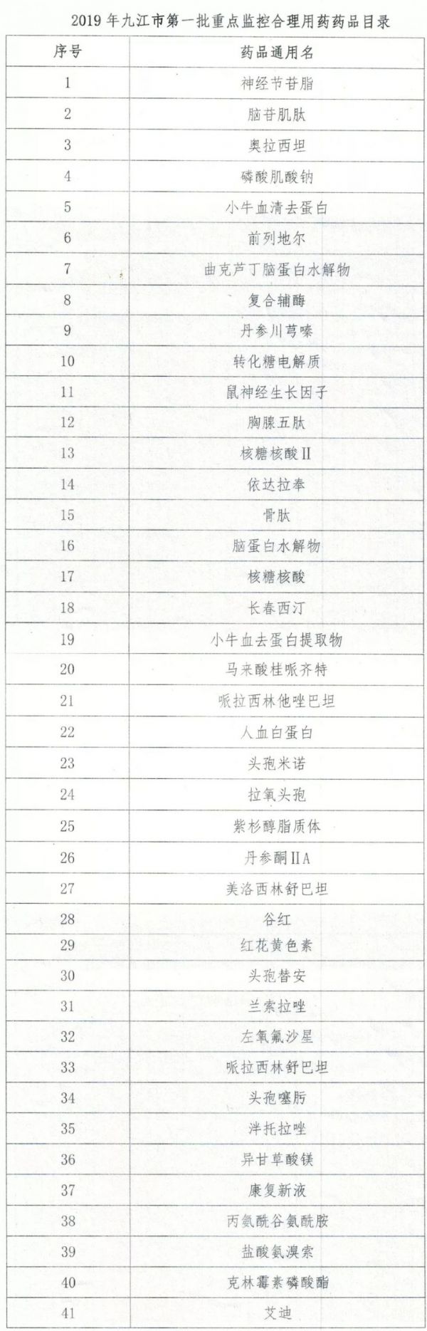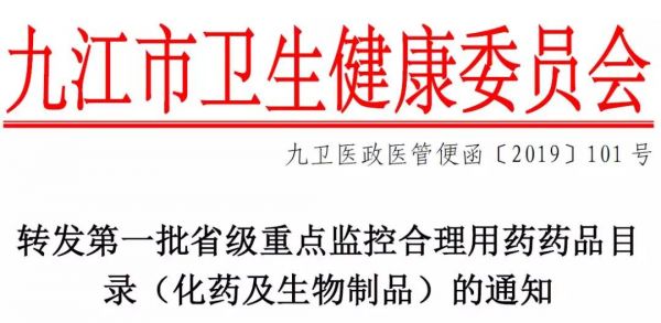 7月23日,江西省九江市卫健委7月22日发布的《转发第一批省级重点监控合理用药药品目录(化药及生物制品)的通知》在行业流传,41个药品在九江市被重点监控(详见附件)。